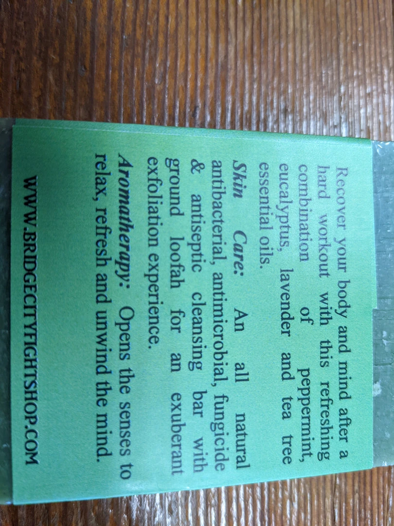 The Newest! Our latest Bridge City Fight Shop soap is a composite of Rice Bran Oil, Water, Coconut Oil, Olive Oil, Vegetable Shortening, Sodium Hydroxide, Castor Seed Oil, Essentail Oil (Peppermint, Eucalyptus, Lavender, Tea Tree, Green Oxide and Ground Loofah.Â