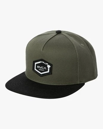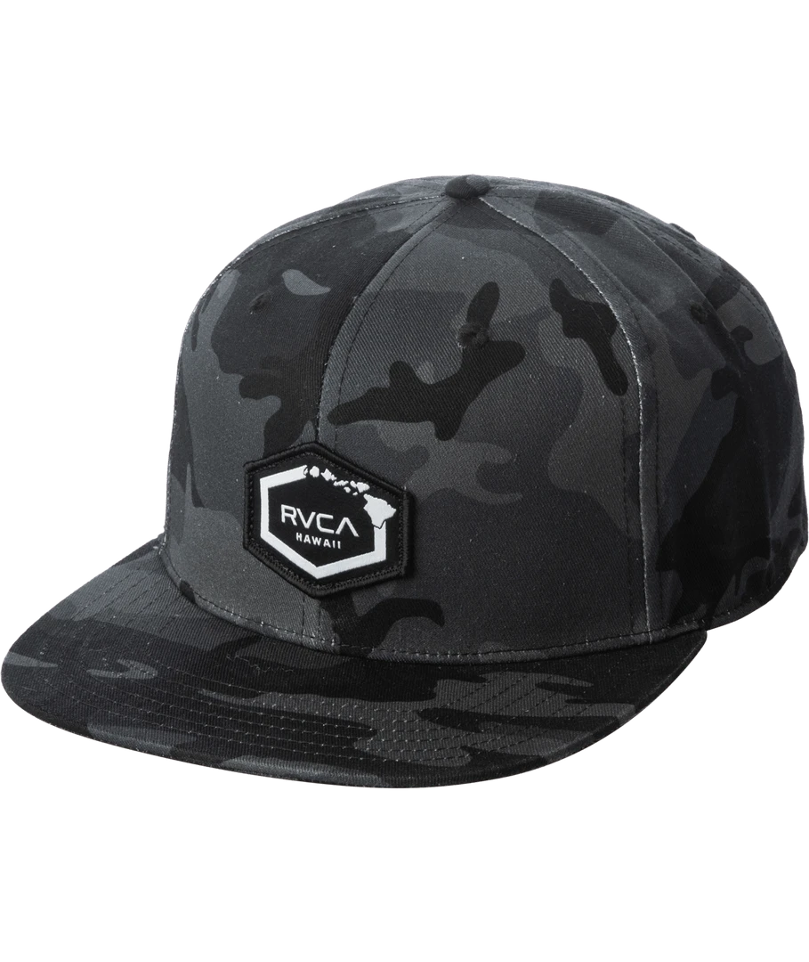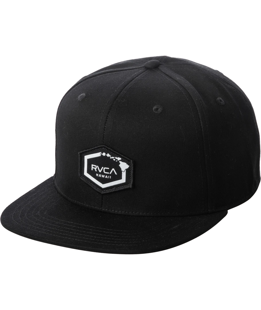 Mid Fit. Structure 5 panel snapback hat. Front Hawaii patch logo. RVCA flag label at back. Â