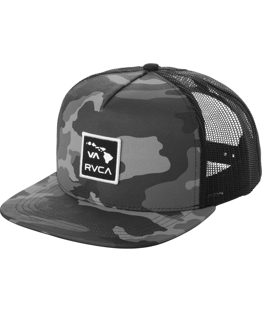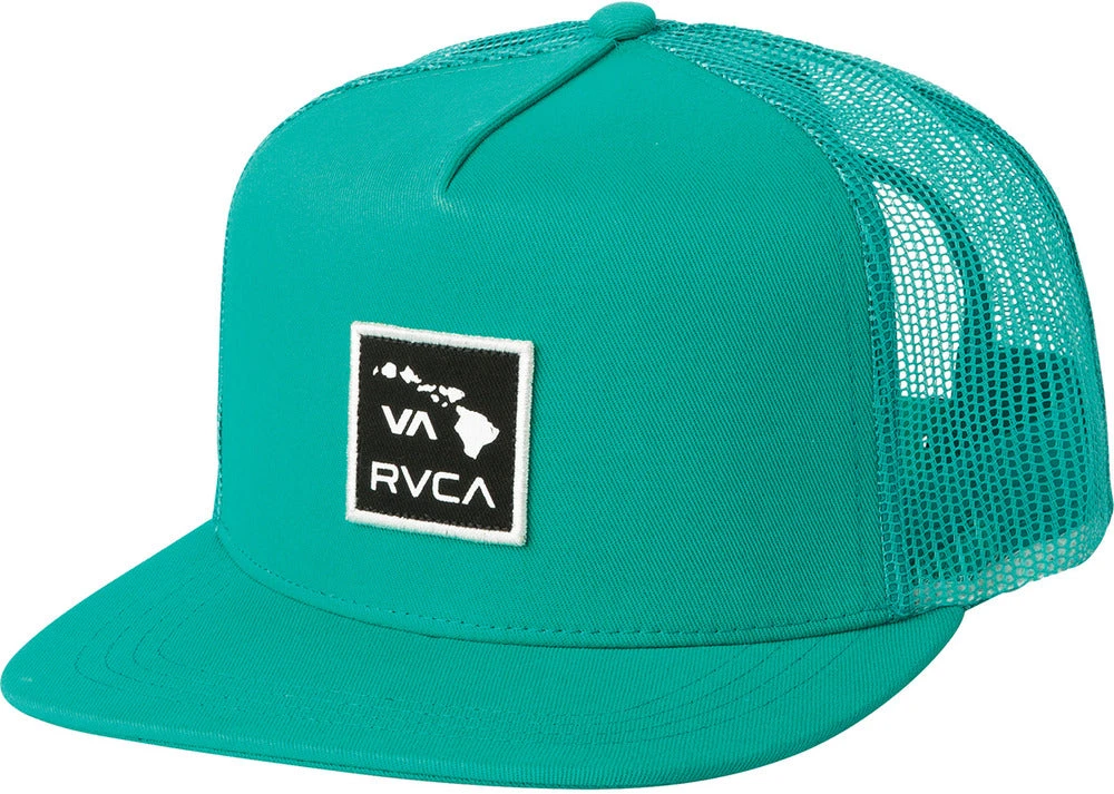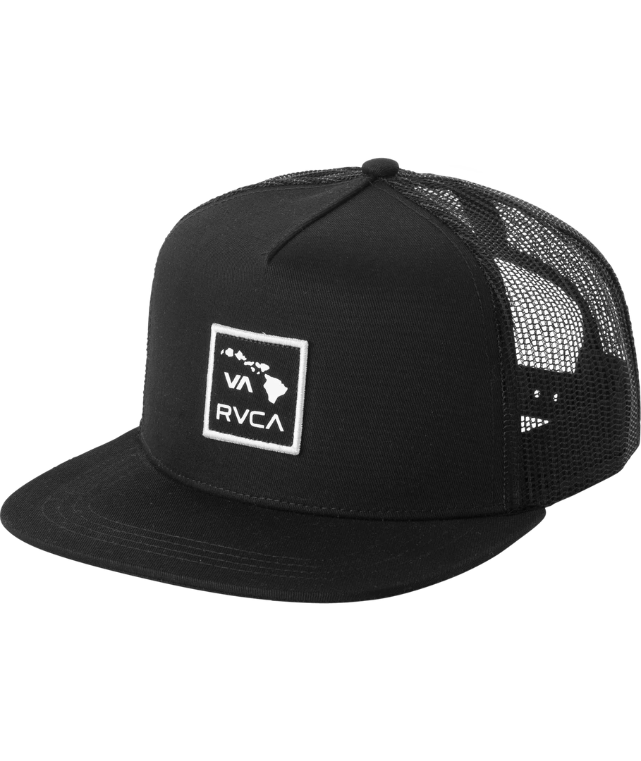 The RVCA Islands Patch Trucker Hat is a deep fit trucker hat with a front merrowed edge Hawaii islands patch and a RVCA flag label at the back.
