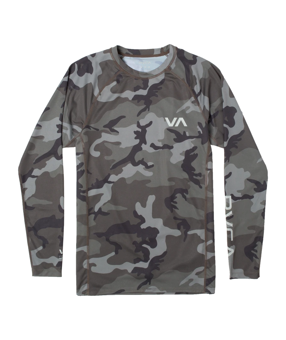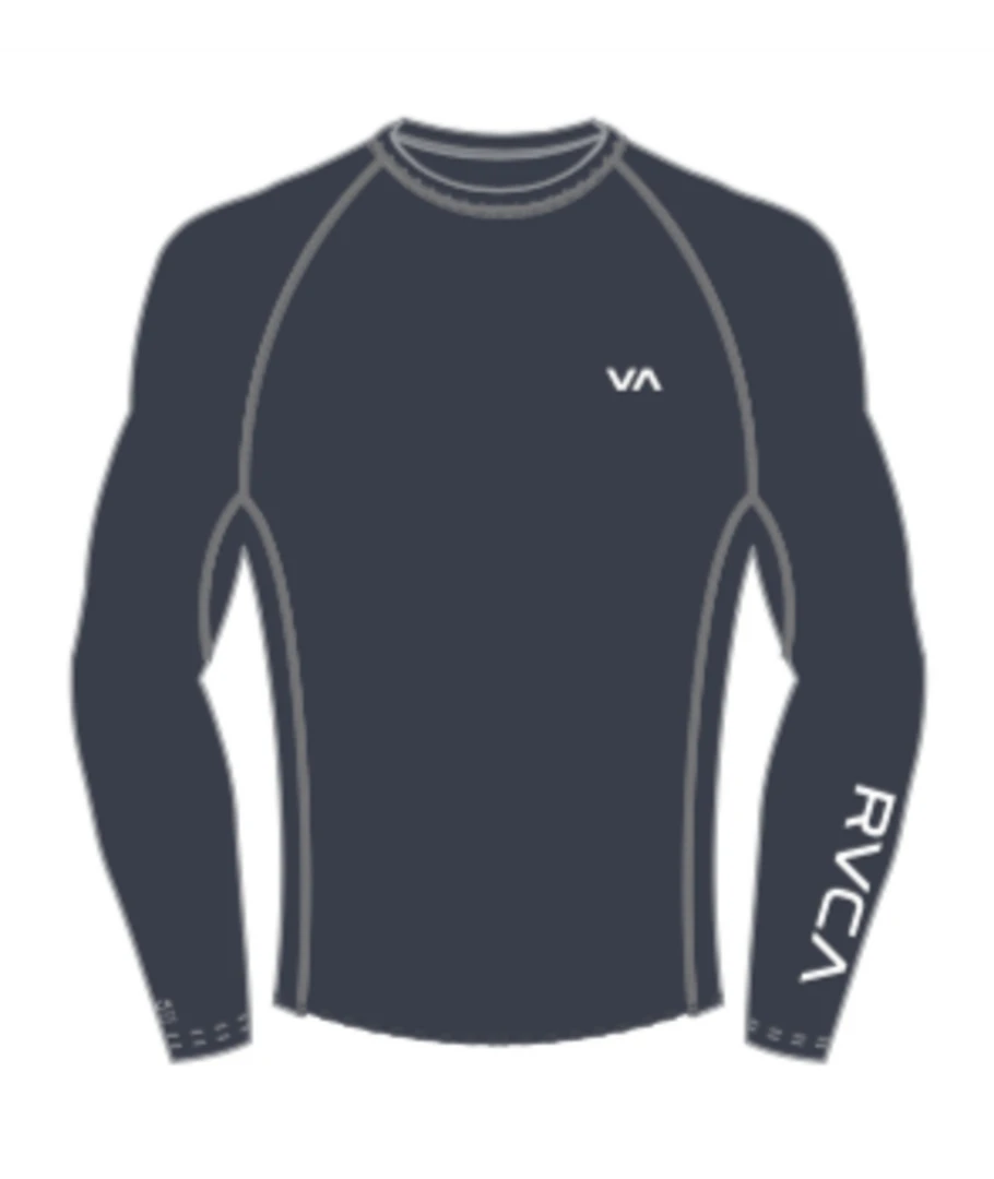 The RVCA Solid Long Sleeve Rashguard is a long sleeve raglan surf top with RVCA and VA screenprints and allover flatlock stitching.
