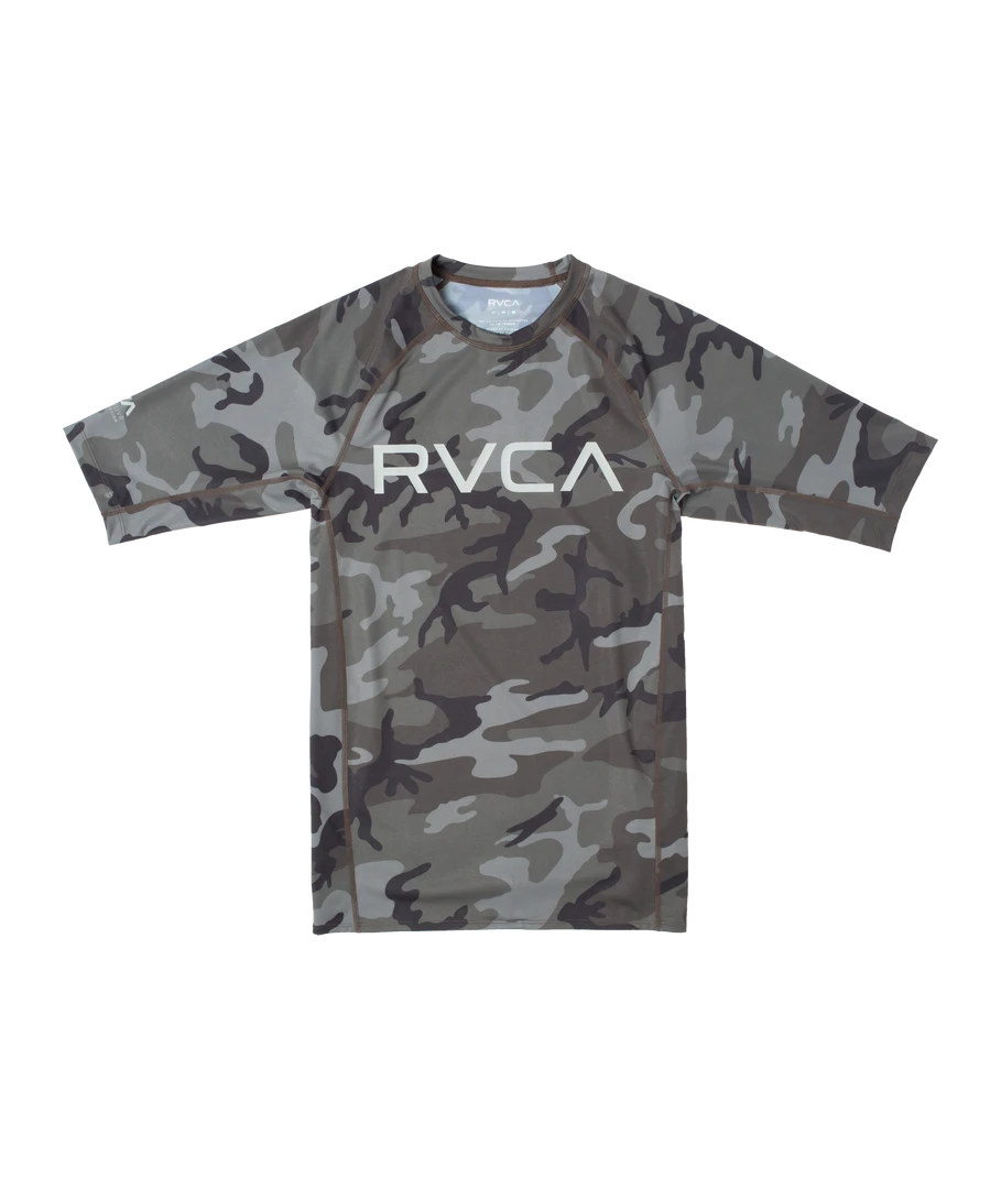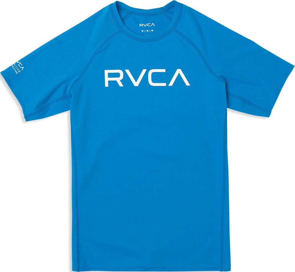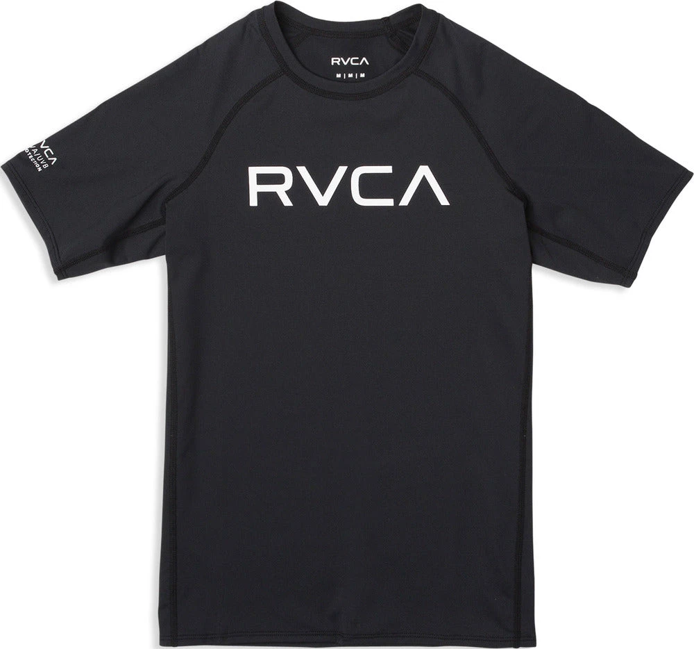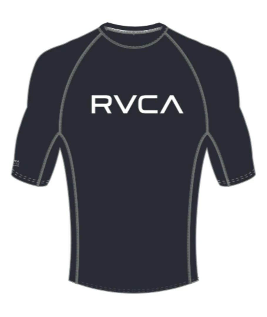 | • Boys rashguard • Short sleeves • Raglan sleeves • Fitted • Paddle pits • Flatlock stitching at neckband, front and back raglan seams • Internal back bottom hem key loop • RVCA and VA screen prints • UVA and UVB protection |