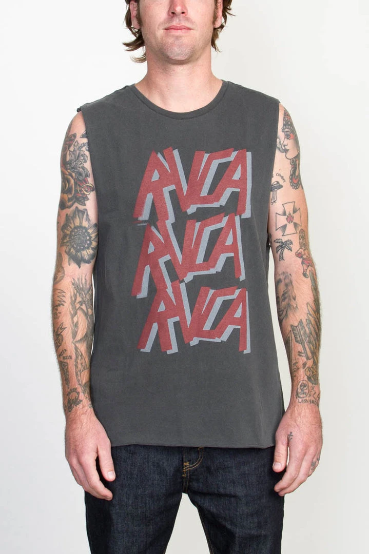 The RVCA Slay RVCA is a regular fit, sleeveless tee with an aged dryhand feel and overdye. The tee has a front screenprint and a screened inside neck.
