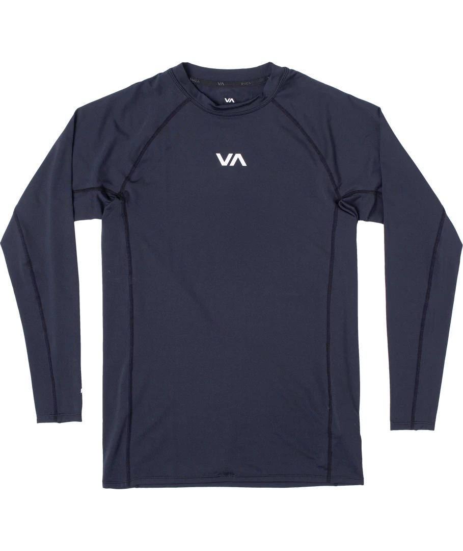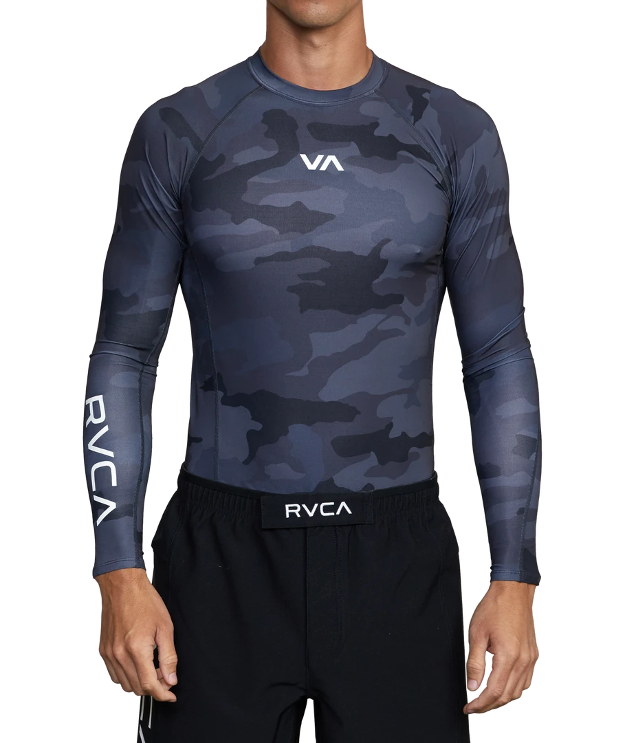 Standard workout clothes reach a new level in the sport long sleeve rashguard. Comfortable polyester and elastane blended fabric mean the right amount of stretch on this men’s performance top. RVCA logo treatments on the chest, back, and right arm keep the overall look of this crew neck mellow. Â