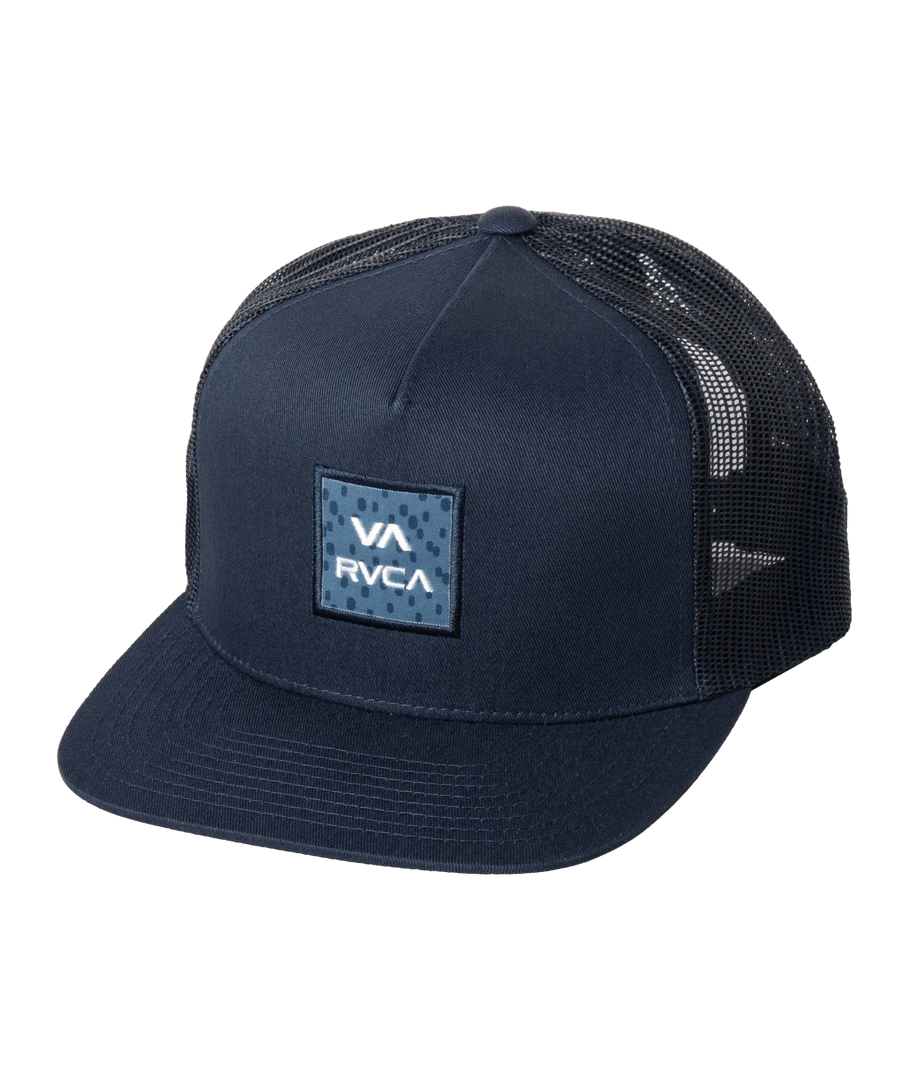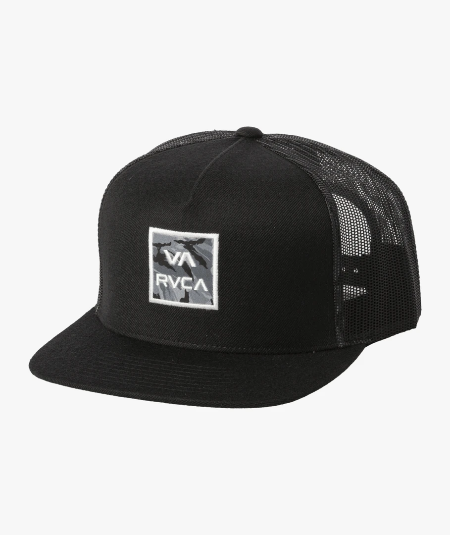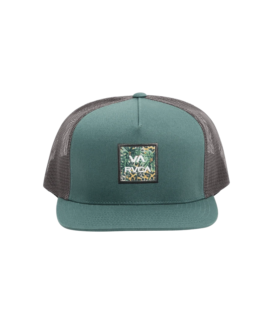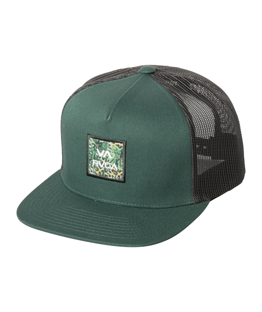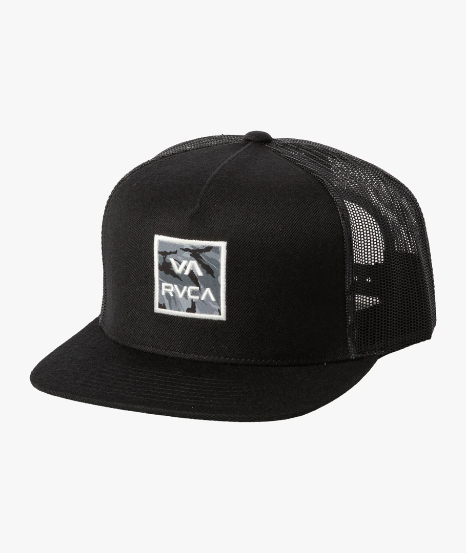 Twill fabrication front with mesh back panels. Mid fit single front panel snapback. Structured front. Printed patch with embroidered RVCA logo. Printed interior taping. RVCA woven flag label at snap. Interior woven fit label. Â
