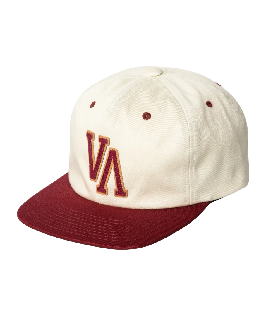Comfort meets style in the RVCA Univ Snapback hat, designed to keep your skull protected all day long. Made from cotton twill for a comfortable feel, this men’s strapback hat features six panel construction in an unstructured, easy, mid fit. Built with an adjustable leather claspback closure for added style, this closet essential is finished off with a custom felt VA logo at the front with leather backing for a pro team look. Â