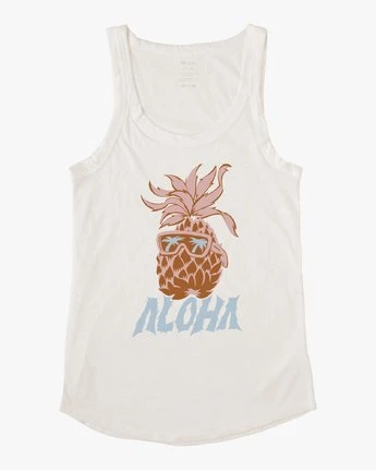 Serve up some of that sweet sunshine in the RVCA Reflections tank top. Part of the RVCA Hawaii collection, this soft tri-blend women’s tank top features a flattering scoop neck and rounded hem, matched with a relaxed fit. The graphic tank is topped with pineapple print at the chest, RVCA print at the upper back and finished with a silicone wash for an extra soft feel. Â