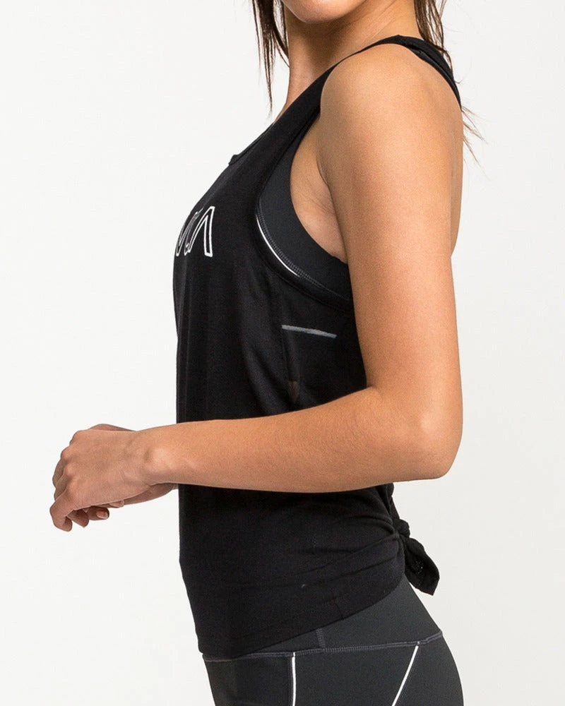 An essential with a little extra breathing room, the RVCA X Top combines a mesh jersey construction with an optional crop top tie at the back. Centered by a RVCA print at the front and trimmed with binding at the neck and arm holes, the womens activewear tank top can be worn loose with a slit at the center back or knotted for a cropped length.