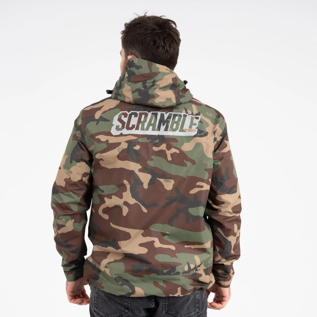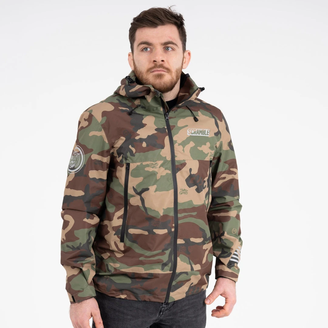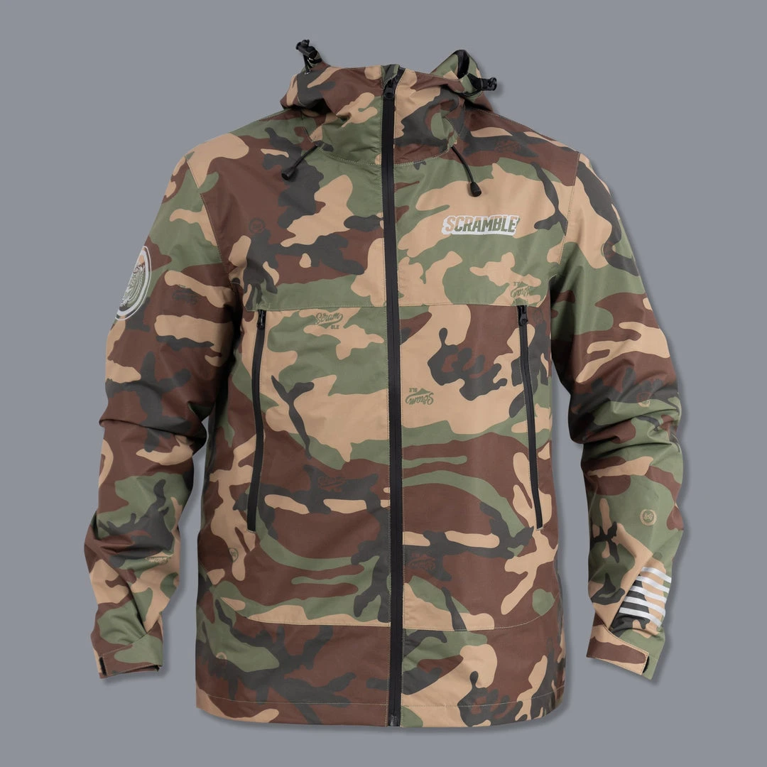 Superior construction, fit and feel. This lightweight rain jacket has an excellent water-resistant nylon construction and coating, including waterproof zippers, and a lightweight mesh liner. An elastic waistband allows you to cinch the jacket if necessary, as do velcro cuffs. The jacket is sublimate printed with our patented woodland camo logo and finished with reflective print Scramble logo hits for nighttime adventures.